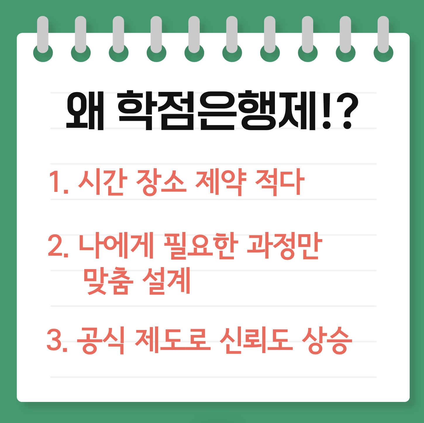 • 공식 제도: 국가평생교육진흥원(NILE)에서 운영·관리하는 공식 학위 제도라 신뢰도 높음.