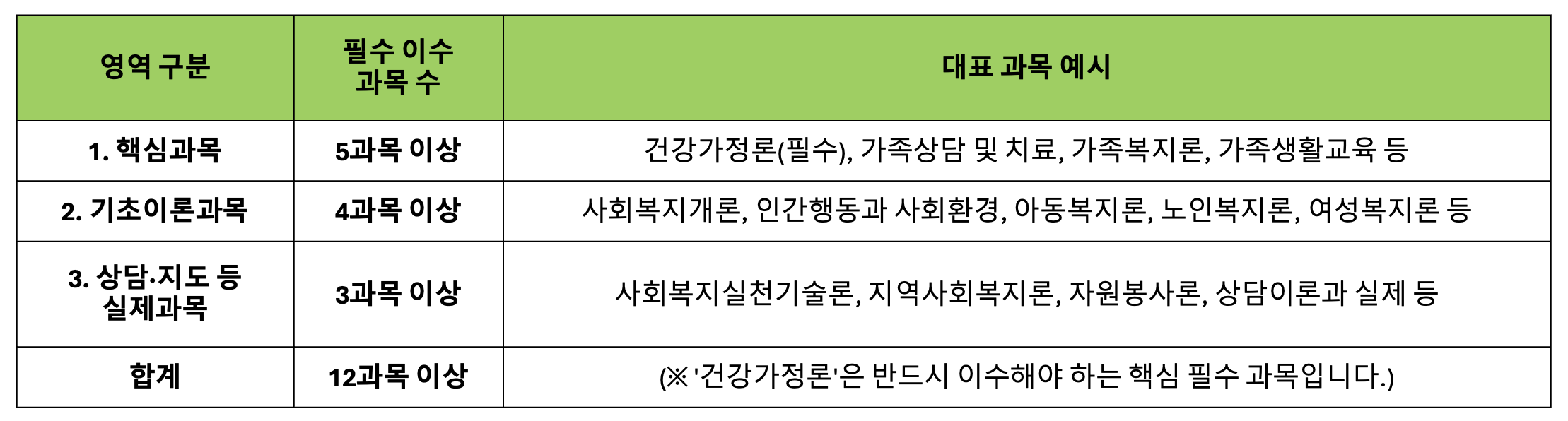 건강가정사 자격을 위해서는 아래 세 가지 영역에서 규정된 과목 수를 채워야 합니다.