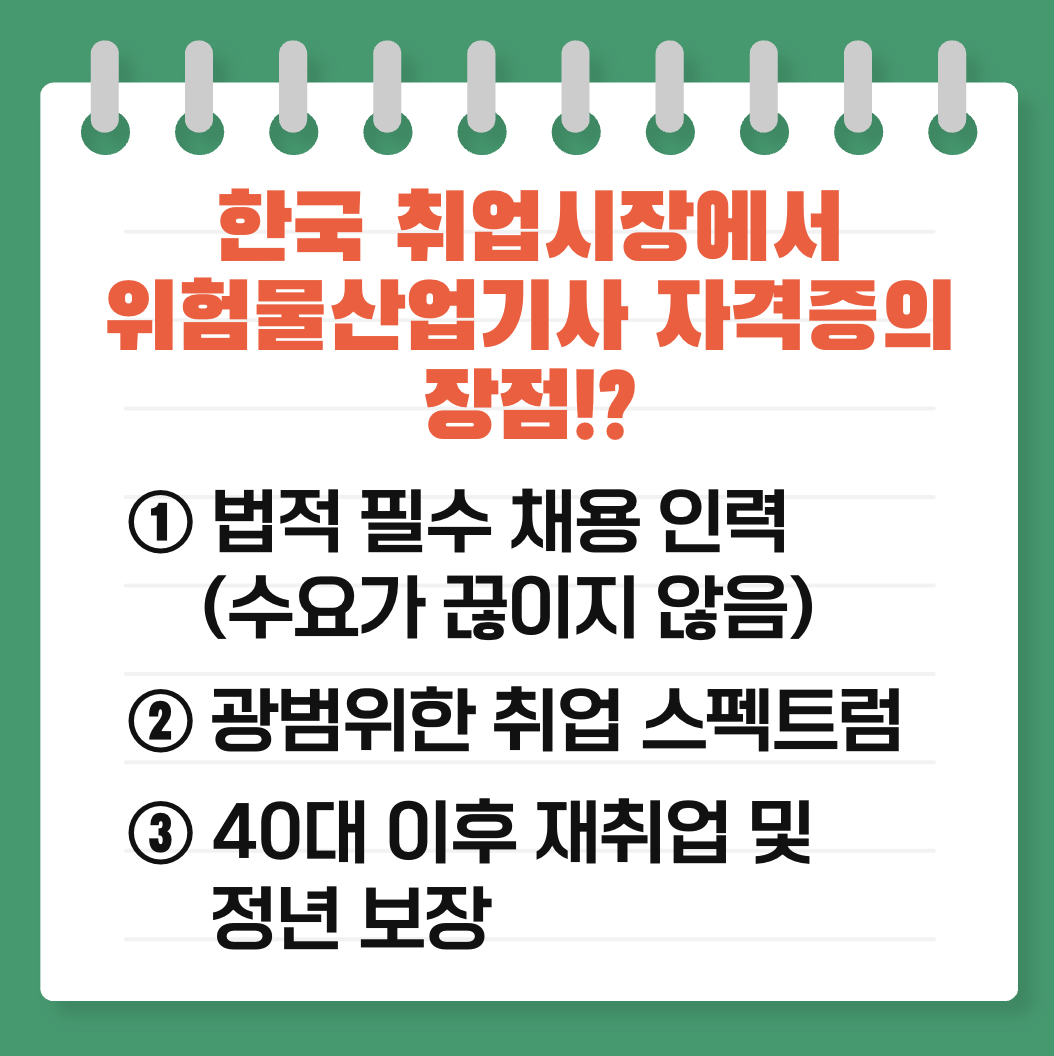 결론적으로, 위험물산업기사는 '법적 선임'이라는 강력한 무기 덕분에 취업 시장에서 수요가 확실한 자격증입니다.