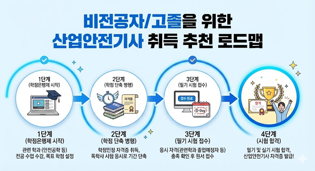 2. 2단계 (학점 단축 병행): 온라인 강의를 들으며 학점으로 인정되는 쉬운 자격증 1개를 취득하여 41학점 요건을 빠르게 완성 (약 3~4개월 소요).