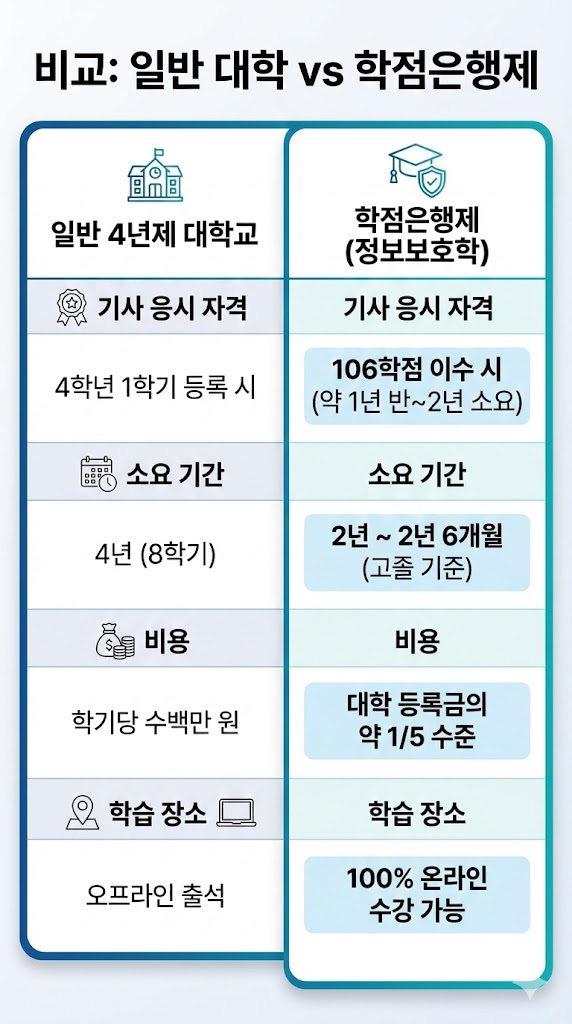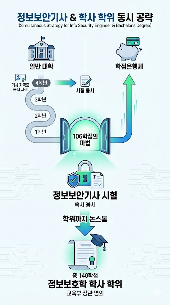 106학점의 마법: 학점은행제로 106학점을 이수하면 4년제 대학 졸업예정자와 동등한 자격을 인정받아 정보보안기사 시험에 즉시 응시할 수 있습니다.