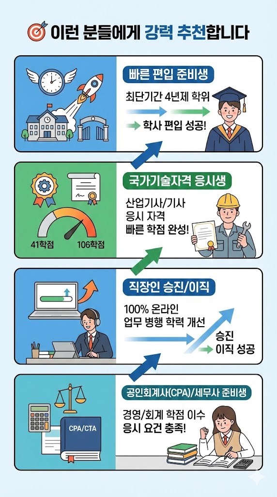 빠른 편입 준비생: 학사 편입을 위해 최단기간에 4년제 학위가 필요한 경우.