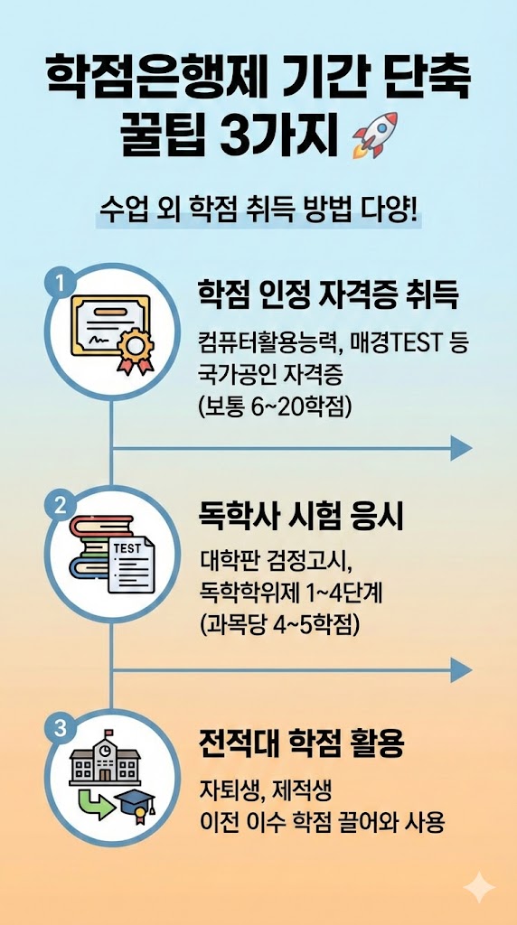 ✔️학점 인정 자격증 취득: 컴퓨터활용능력, 매경TEST 등 국가공인 자격증을 취득하면 학점으로 인정됩니다. (보통 6~20학점)