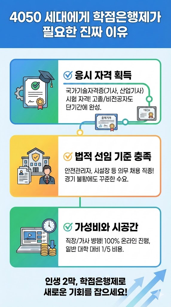 나이 40, 50에 학점은행제(학은제)를 고민하신다면, 이는 단순한 '학위 취득'이 아닌 '생존'과 '제2의 직업'을 위한 전략적 도구로 접근해야 합니다.