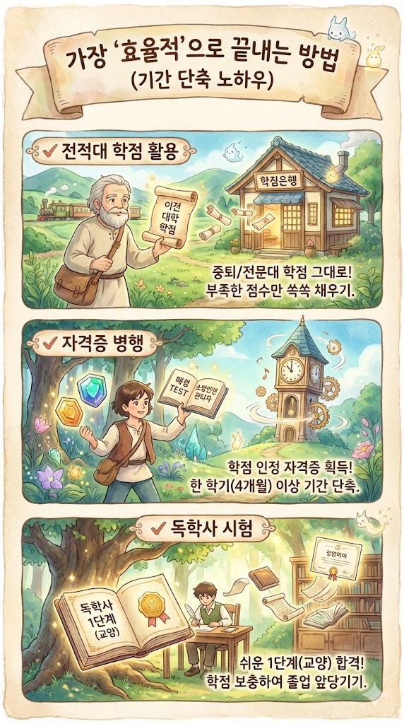 ✔️ 자격증 병행: 학점으로 인정되는 자격증(예: 매경TEST, 소방안전관리자 등)을 취득하면 한 학기(약 4개월) 이상의 기간을 단축할 수 있습니다.