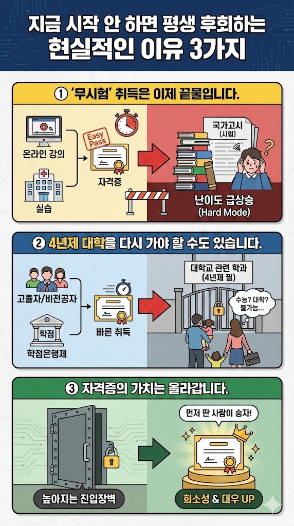 제도가 바뀌기 전에 따놓은 자격증은 그대로 인정받습니다. 문이 닫히기 전에 들어간 사람만이 승자가 되는 구조입니다.