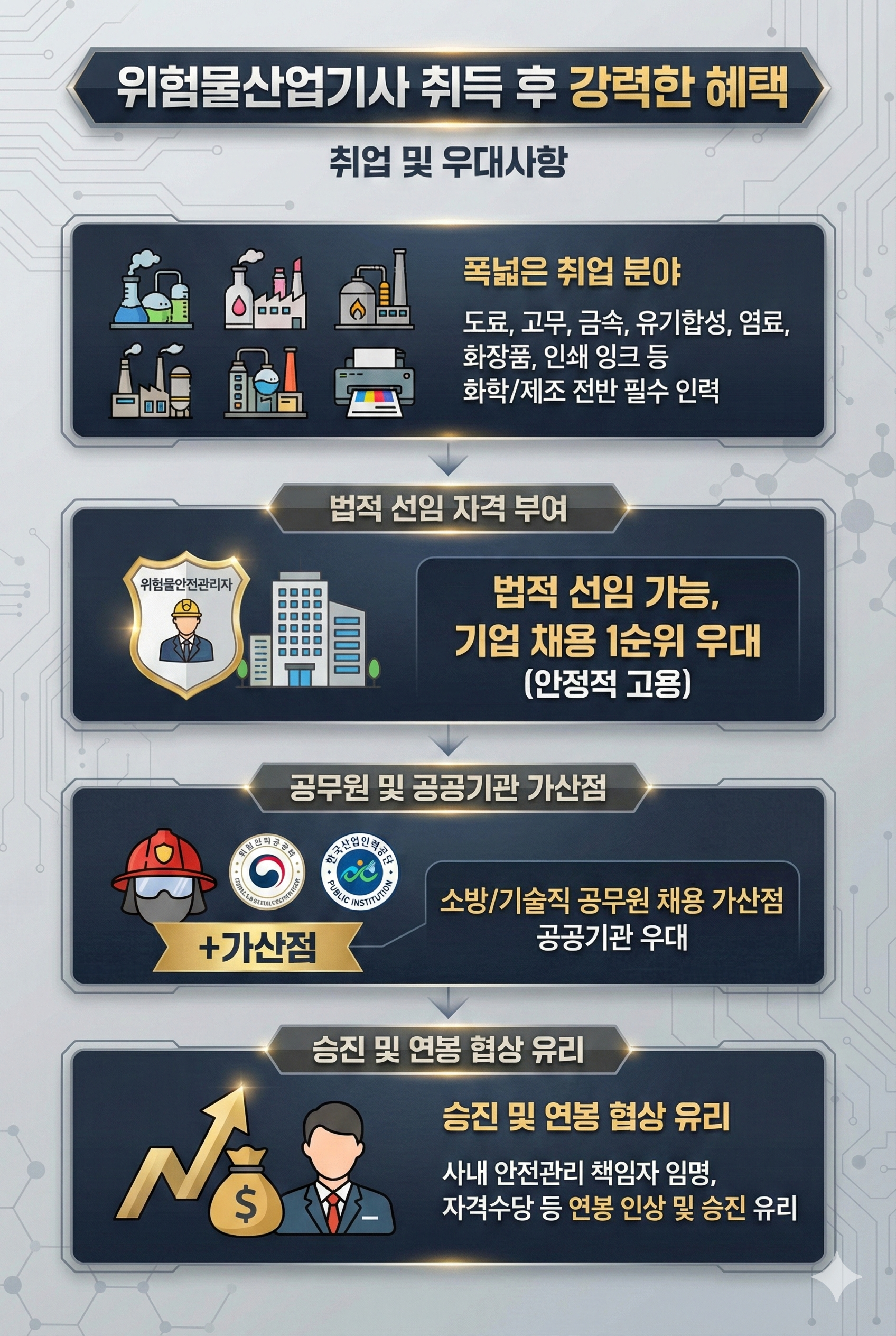 ✔️ 승진 및 연봉 협상 유리: 사내 안전관리 책임자로 임명될 수 있어 자격수당 등 연봉 인상과 승진에 매우 유리하게 작용합니다.